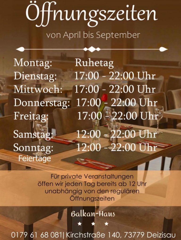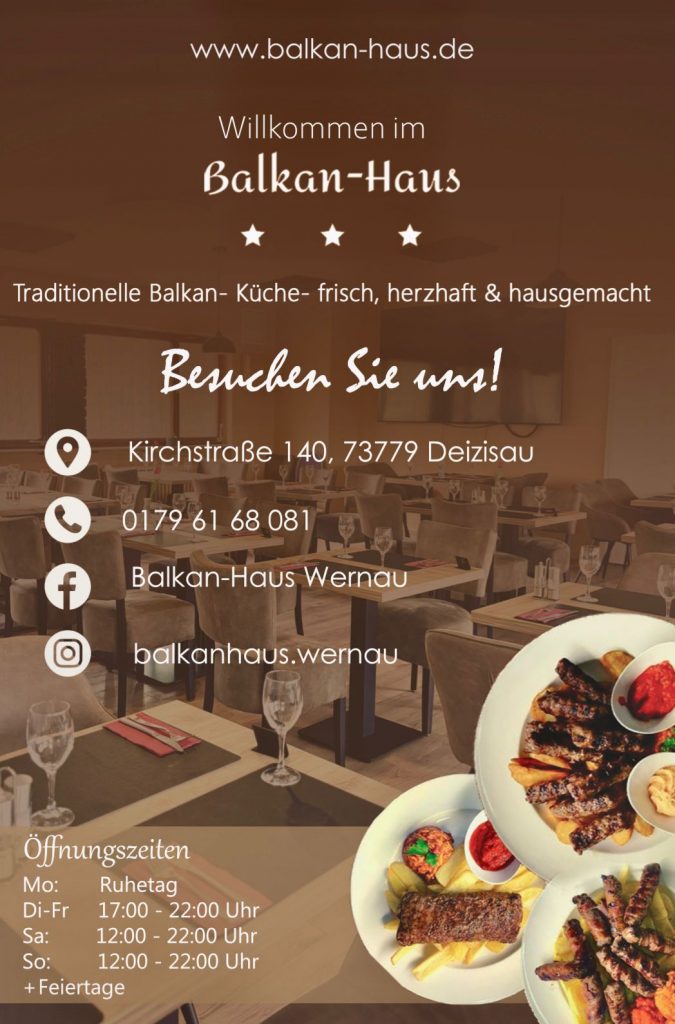 Gutes Essen, gesellige Events - unter diesem Motto haben wir das Balkan-Haus im Februar 2020 direkt neben dem Wernauer Freibad eröffnet. Unseren Ursprung haben wir in der traditionellen Küche des Balkans. Dabei schätzen wir die Vielfalt der Kulturen in unserer Heimat und bieten daher ebenso Speisen an, die auch strengen Speisevorschriften gerecht werden.