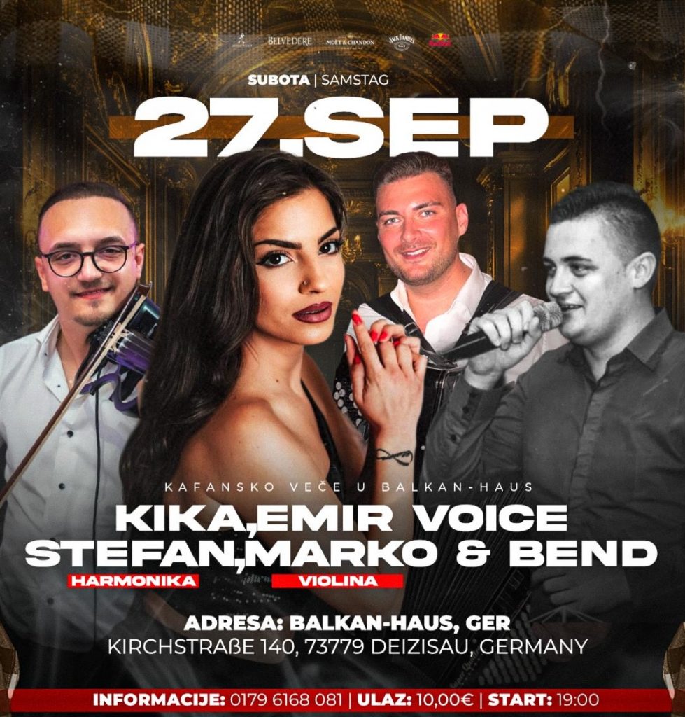 Tolle Musik gibt es von Ceca, Stole, Mijo und Nemanja. Die Party beginnt am Samstag um 19 Uhr. Die Tickets gibt’s für 49 € direkt im Balkan-Haus!